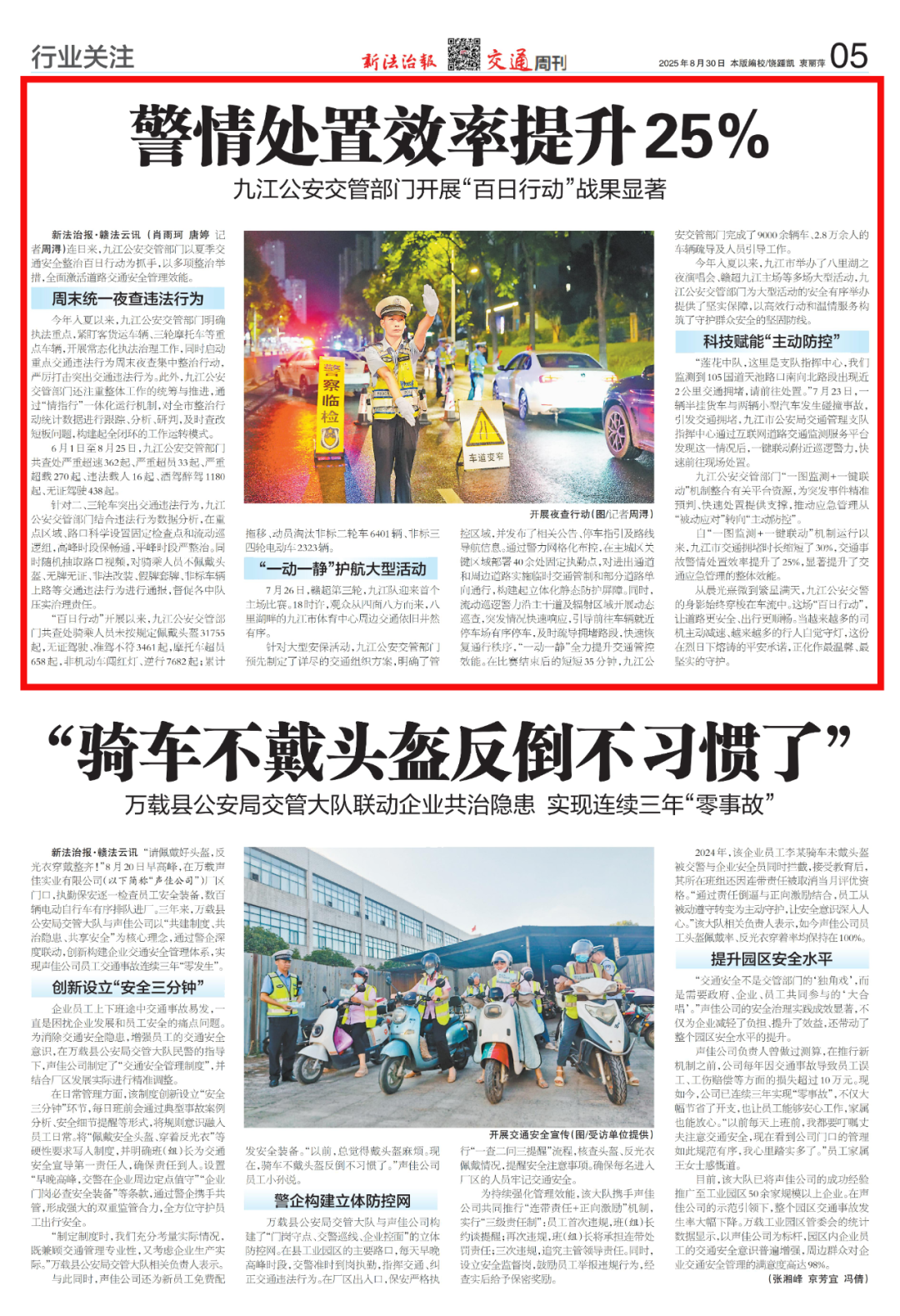 ![]() (点击查看大图) ![]() 连日来,九江公安交管部门以夏季交通安全整治百日行动为抓手,以多项整治举措,全面激活道路交通安全管理效能。 ![]() ![]() 今年入夏以来,九江公安交管部门明确执法重点,紧盯客货运车辆、三轮摩托车等重点车辆,开展常态化执法治理工作,同时启动重点交通违法行为周末夜查集中整治行动,严厉打击突出交通违法行为。此外,九江公安交管部门还注重整体工作的统筹与推进,通过“情指行”一体化运行机制,对全市整治行动统计数据进行跟踪、分析、研判,及时查改短板问题,构建起全闭环的工作运转模式。 6月1日至8月25日,九江公安交管部门共查处严重超速362起、严重超员33起、严重超载270起、违法载人16起、酒驾醉驾1180起、无证驾驶438起。 针对二、三轮车突出交通违法行为,九江公安交管部门结合违法行为数据分析,在重点区域、路口科学设置固定检查点和流动巡逻组,高峰时段保畅通,平峰时段严整治。同时随机抽取路口视频,对骑乘人员不佩戴头盔、无牌无证、非法改装、假牌套牌、非标车辆上路等交通违法行为进行通报,督促各中队压实治理责任。 “百日行动”开展以来,九江公安交管部门共查处骑乘人员未按规定佩戴头盔31755起,无证驾驶、准驾不符3461起,摩托车超员658起,非机动车闯红灯、逆行7682起;累计拖移、动员淘汰非标二轮车6401辆、非标三四轮电动车2323辆。 ![]() 7月26日,赣超第三轮,九江队迎来首个主场比赛。18时许,观众从四面八方而来,八里湖畔的九江市体育中心周边交通依旧井然有序。 针对大型安保活动,九江公安交管部门预先制定了详尽的交通组织方案,明确了管控区域,并发布了相关公告、停车指引及路线导航信息。通过警力网格化布控,在主城区关键区域部署40余处固定执勤点,对进出通道和周边道路实施临时交通管制和部分道路单向通行,构建起立体化静态防护屏障。同时,流动巡逻警力沿主干道及辐射区域开展动态巡查,突发情况快速响应,引导前往车辆就近停车场有序停车,及时疏导拥堵路段,快速恢复通行秩序,“一动一静”全力提升交通管控效能。在比赛结束后的短短35分钟,九江公安交管部门完成了9000余辆车、2.8万余人的车辆疏导及人员引导工作。 今年入夏以来,九江市举办了八里湖之夜演唱会、赣超九江主场等多场大型活动,九江公安交管部门为大型活动的安全有序举办提供了坚实保障,以高效行动和温情服务构筑了守护群众安全的坚固防线。 ![]() “莲花中队,这里是支队指挥中心,我们监测到105国道天池路口南向北路段出现近2公里交通拥堵,请前往处置。”7月23日,一辆半挂货车与两辆小型汽车发生碰撞事故,引发交通拥堵,九江市公安局交通管理支队指挥中心通过互联网道路交通监测服务平台发现这一情况后,一键联动附近巡逻警力,快速前往现场处置。 九江公安交管部门“一图监测+一键联动”机制整合有关平台资源,为突发事件精准预判、快速处置提供支撑,推动应急管理从“被动应对”转向“主动防控”。 自“一图监测+一键联动”机制运行以来,九江市交通拥堵时长缩短了30%,交通事故警情处置效率提升了25%,显著提升了交通应急管理的整体效能。 从晨光熹微到繁星满天,九江公安交警的身影始终穿梭在车流中。这场“百日行动”,让道路更安全、出行更顺畅。当越来越多的司机主动减速、越来越多的行人自觉守灯,这份在烈日下熔铸的平安承诺,正化作最温馨、最坚实的守护。 (来源:《新法治报·交通周刊》) |