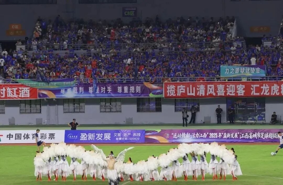 这套智慧安保体系,早已不止于赛场——九江音乐节欢呼中、庐山电影爱情周的光影里,它都在默默守护。今年以来,全市大型活动安保“万无一失”,科技赋能的新质战斗力,正为城市发展注入“稳稳的安全感”。 从一张球票到一城烟火的平安底色 此次赣超比赛间隙,省鸟白鹤突然“飞”入赛场,原创舞剧《大湖之灵》惊觉亮相。节目通过灵动舞姿再现白鹤觅食、振翅的场景,仿佛鄱阳湖畔的精灵跃然眼前。这场表演不仅展现了九江“山水之城”的生态之美,更有许多网友评论:九江,赣超赛场里最浪漫的城市。