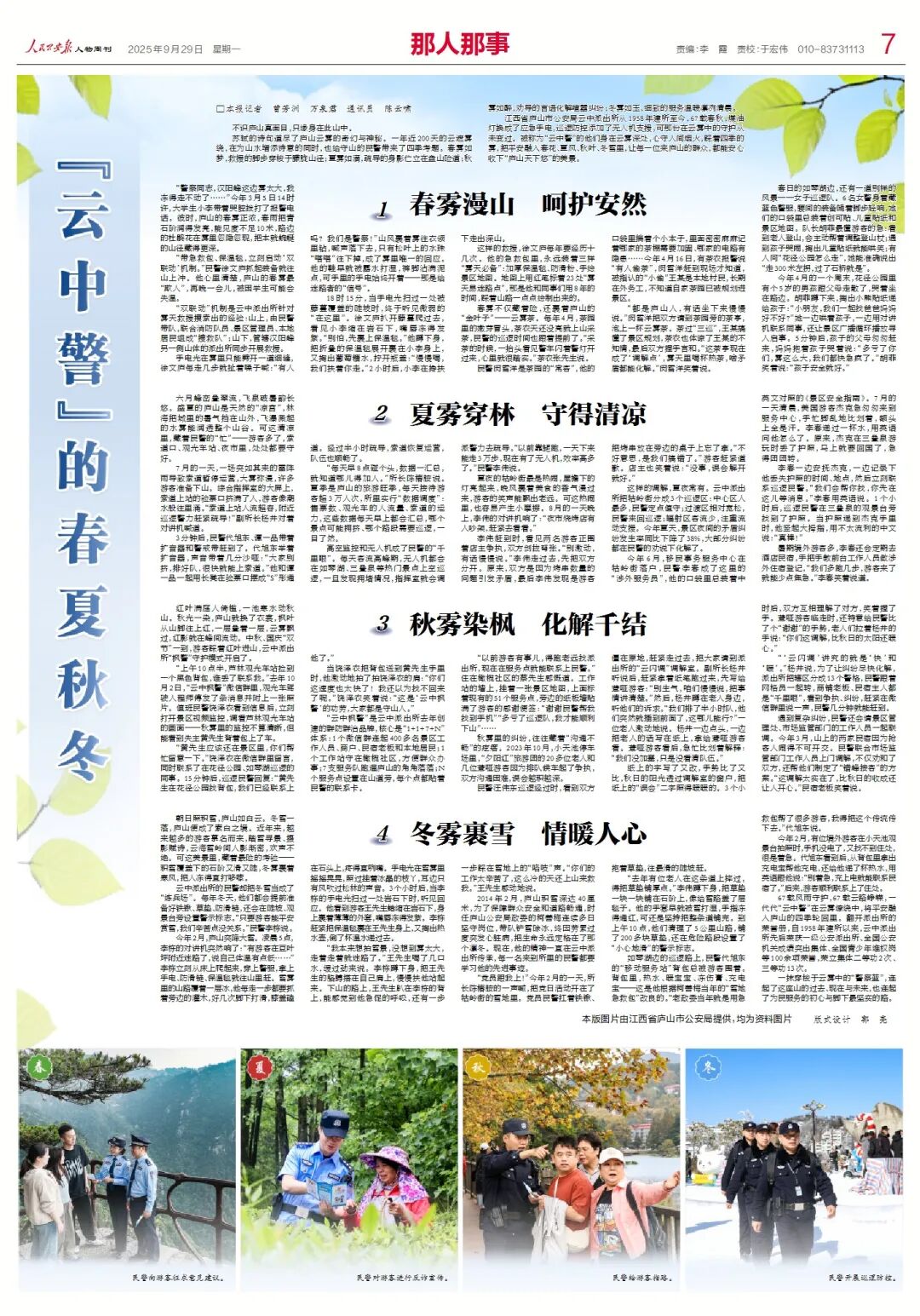 ![]() □本报记者 曾芳洲 万泉君 通讯员 陈云啸 不识庐山真面目,只缘身在此山中。 苏轼的诗句道尽了庐山云雾的奇幻与神秘。一年近200天的云遮雾绕,在为山水增添诗意的同时,也给守山的民警带来了四季考题。春雾如梦,救援的脚步穿梭于朦胧山径;夏雾如滴,疏导的身影伫立在盘山险道;秋雾如醉,劝导的言语化解喧嚣纠纷;冬雾如玉,细致的服务温暖凛冽清晨。 江西省庐山市公安局云中派出所从1958年建所至今,67载春秋,煤油灯换成了应急手电,巡逻防控添加了无人机支援,可那份在云雾中的守护从未变过。被称为“云中警”的他们身在云雾深处,心守人间烟火,踩着四季的雾,把平安融入春花、夏风、秋叶、冬雪里,让每一位来庐山的群众,都能安心收下“庐山天下悠”的美景。 春雾漫山 呵护安然 ![]() ![]() △民警向游客征求意见建议。 “警察同志,汉阳峰这边雾太大,我冻得走不动了……”今年3月5日14时许,大学生小李带着哭腔拨打了报警电话。彼时,庐山的春雾正浓,春雨把青石阶润得发亮,能见度不足10米,路边的杜鹃花在雾里忽隐忽现,把本就蜿蜒的山径藏得更深。 “带急救包、保温毯,立刻启动‘双联动’机制。”民警徐文庐抓起装备就往山上冲。他心里清楚,庐山的春雾最“欺人”,再晚一会儿,被困学生可能会失温。 “双联动”机制是云中派出所针对雾天救援摸索出的经验:山上,由民警带队,联合消防队员、景区管理员、本地居民组成“搜救队”;山下,管辖汉阳峰另一侧山体的派出所同步开展救援。 手电光在雾里只能劈开一道细缝,徐文庐每走几步就扯着嗓子喊:“有人吗?我们是警察!”山风裹着雾往衣领里钻,喊声落下去,只有松叶上的水珠“嗒嗒”往下掉,成了雾里唯一的回应。他的鞋早就被露水打湿,裤脚沾满泥点,可手里的手电始终开着——那是给迷路者的“信号”。 18时15分,当手电光扫过一处被藤蔓覆盖的陡坡时,终于听见微弱的“在这里”。徐文庐扒开藤蔓爬过去,看见小李缩在岩石下,嘴唇冻得发紫。“别怕,先裹上保温毯。”他蹲下身,把折叠的保温毯展开裹在小李身上,又掏出葡萄糖水,拧开瓶盖:“慢慢喝,我们扶着你走。”2小时后,小李在搀扶下走出深山。 这样的救援,徐文庐每年要经历十几次。他的急救包里,永远装着三样“雾天必备”:加厚保温毯、防滑粉、手绘景区地图。地图上用红笔标着23处“雾天易迷路点”,那是他和同事们用8年的时间,踩着山路一点点绘制出来的。 春雾不仅藏着险,还裹着庐山的“金叶子”——云雾茶。每年4月,茶园里的嫩芽冒头,茶农天还没亮就上山采茶,民警的巡逻时间也跟着提前了。“采茶的时候,一抬头看见警车闪着警灯开过来,心里就很踏实。”茶农张先生说。 民警闵雪洋是茶园的“常客”,他的口袋里揣着个小本子,里面密密麻麻记着哪家的茶棚需要加固、哪家的电路有隐患……今年4月16日,有茶农报警说“有人偷茶”,闵雪洋赶到现场才知道,被指认的“小偷”王某是本地村民,长期在外务工,不知道自家茶园已被规划进景区。 “都是庐山人,有话坐下来慢慢说。”闵雪洋把双方请到茶园旁的茶亭,泡上一杯云雾茶。茶过“三巡”,王某搞懂了景区规划,茶农也体谅了王某的不知情,最后双方握手言和。“这茶亭现在成了‘调解点’,雾天里喝杯热茶,啥矛盾都能化解。”闵雪洋笑着说。 春日的如琴湖边,还有一道别样的风景——女子巡逻队。6名女警身着藏蓝色警服,腰间的装备随着脚步轻响,她们的口袋里总装着创可贴、儿童贴纸和景区地图。队长胡菲最懂游客的急:看到老人登山,会主动帮着调整登山杖;遇到孩子哭闹,掏出儿童贴纸就能哄笑;有人问“花径公园怎么走”,她能准确说出“走300米左拐,过了石桥就是”。 夏雾穿林 守得清凉 ![]() ![]() △民警对游客进行反诈宣传。 六月峰峦叠翠流,飞泉破暑韵长悠。盛夏的庐山是天然的“凉宫”,林海把城里的暑气挡在山外,飞瀑溅起的水雾能润透整个山谷。可这清凉里,藏着民警的“忙”——游客多了,索道口、观光车站、夜市里,处处都要守好。 7月的一天,一场突如其来的雷阵雨导致索道暂停运营,大雾弥漫,许多游客准备下山。综合指挥室的大屏上,索道上站的验票口挤满了人,游客像潮水般往里涌。“索道上站人流超容,附近巡逻警力赶紧疏导!”副所长杨井对着对讲机喊道。 3分钟后,民警代旭东、谭一品带着扩音器和警戒带赶到了。代旭东举着扩音器,声音带着几分沙哑:“大家别挤,排好队,很快就能上索道。”他和谭一品一起用长凳在验票口摆成“S”形通道。经过半小时疏导,索道恢复运营,队伍也顺畅了。 “每天早8点碰个头,数据一汇总,就知道哪儿得加人。”所长陈椿胺说。夏季是庐山的旅游旺季,每天接待游客超3万人次,所里实行“数据调度”:售票数、观光车的人流量、索道的运力,这些数据每天早上都会汇总,哪个景点可能拥挤、哪个路段需要巡逻,一目了然。 高空监控和无人机成了民警的“千里眼”。每天客流高峰期,无人机都会在如琴湖、三叠泉等热门景点上空巡逻,一旦发现拥堵情况,指挥室就会调派警力去疏导。“以前靠腿跑,一天下来能走3万步,现在有了无人机,效率高多了。”民警李伟说。 夏夜的牯岭街最是热闹,屋檐下的灯亮起来,晚风裹着美食的香气漫过来,游客的笑声能飘出老远。可这热闹里,也容易产生小摩擦。8