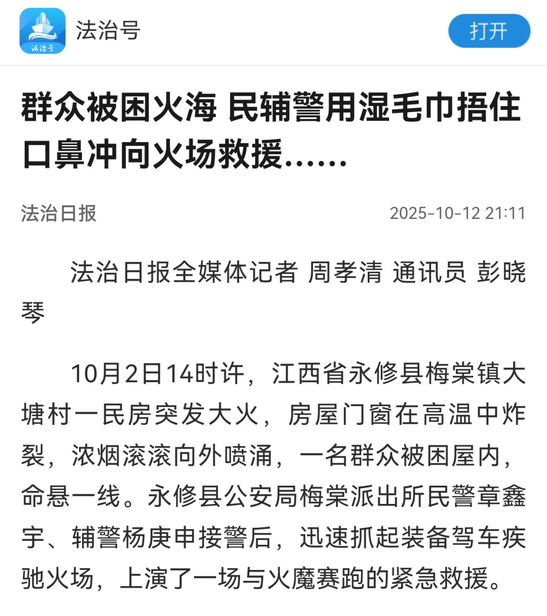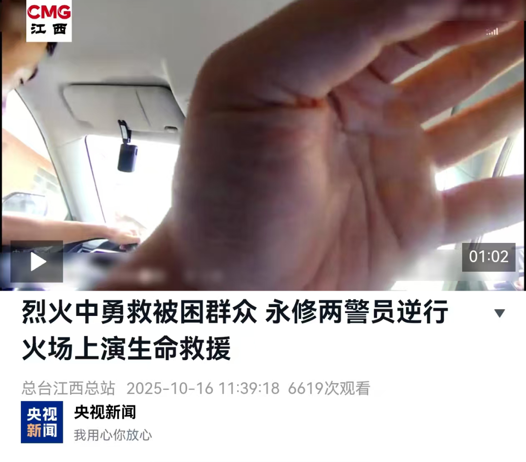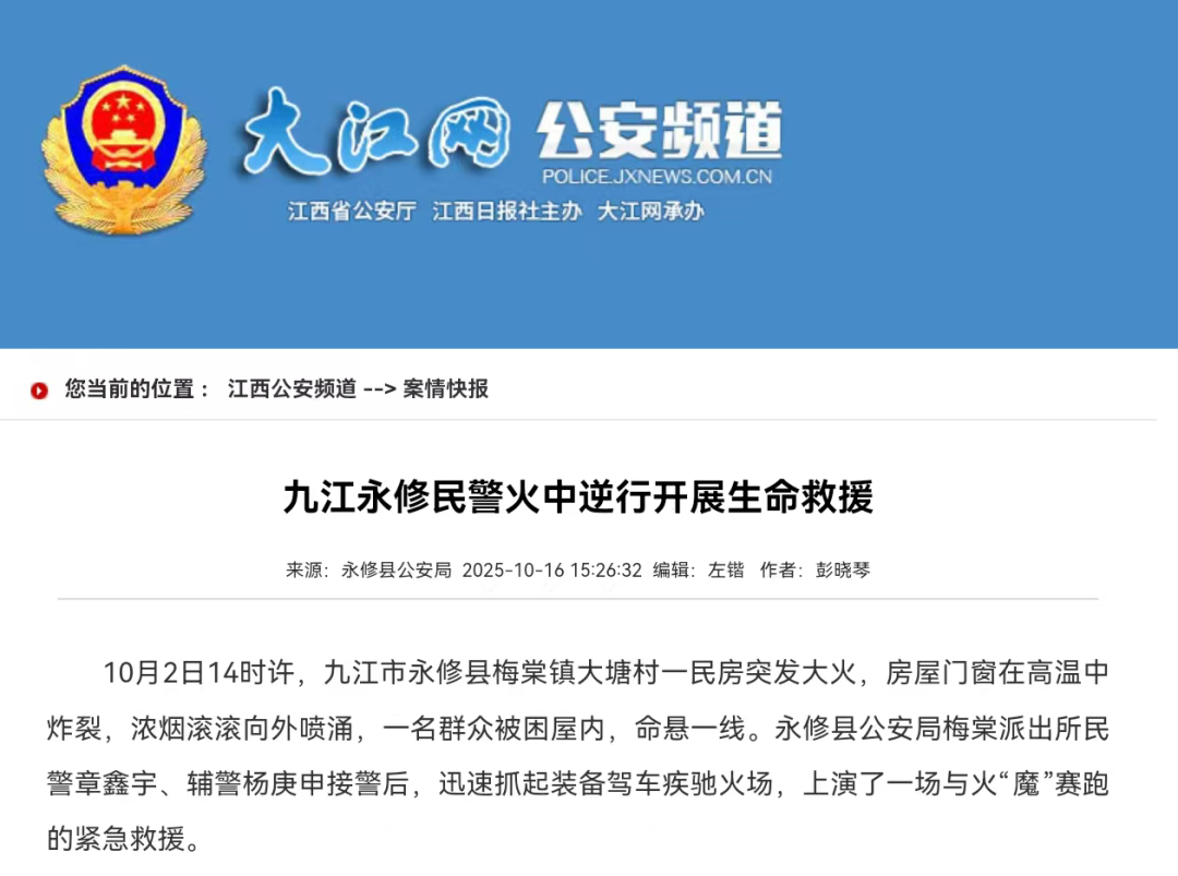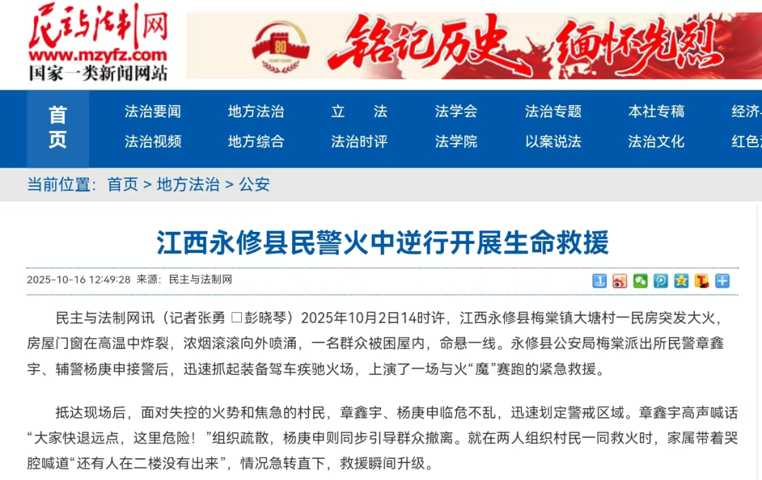 新华社、央视新闻、法治日报 公安部、公安部新闻传媒 江西日报、江西公安 民主与法制网、大江网、新法治报等 中央、国省级主流媒体纷纷聚焦 永修县公安局梅棠派出所 民警章鑫宇、辅警杨庚申 在危急关头冲入火场 成功救出被困群众的英勇事迹 一场惊心动魄的救援 引发了社会各界的强烈反响与点赞 ![]() 新华社