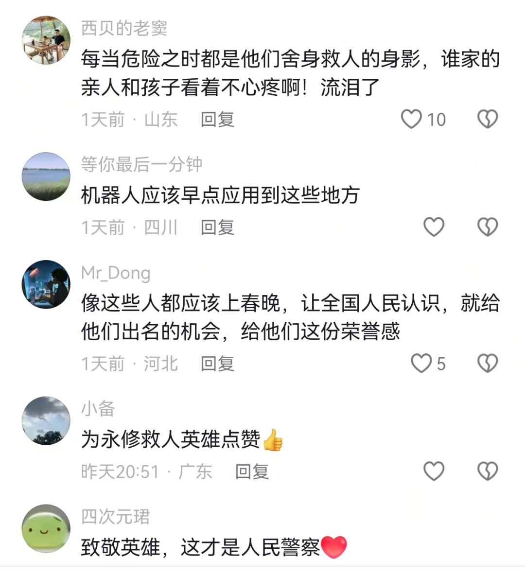 法治日报法治号 ![]() 民主与法制网 ![]() 大江网 ![]() 报道一经推出 数名网友为之动容 自发成为英雄事迹 的“传播者”与“点赞人” ![]() ![]() ![]() ![]() 没有人生而无畏 只是选择了勇敢 这句话说的就是永修公安! 硬核守护,好样的! |