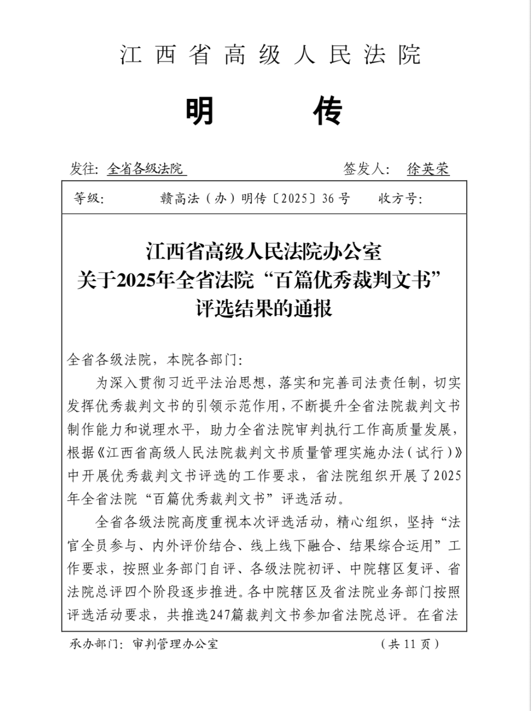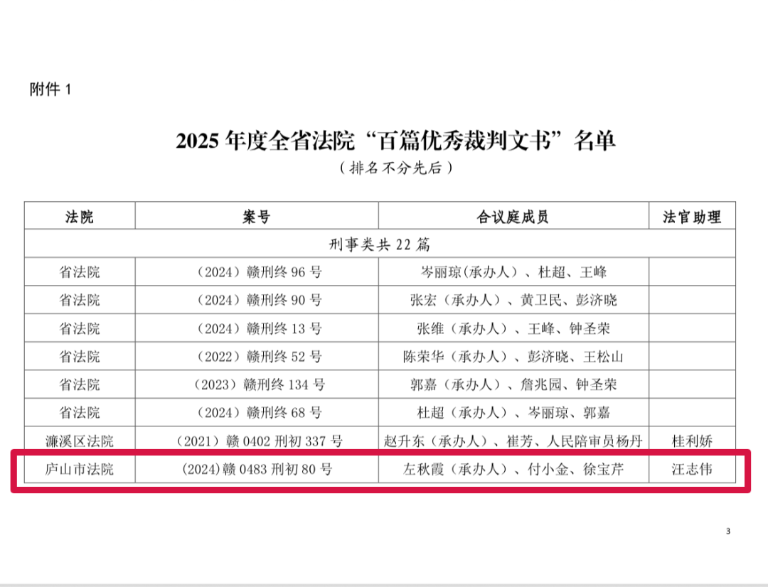 ![]() 近日,江西省高级人民法院办公室发布关于2025年全省法院“百篇优秀裁判文书”评选结果的通报,其中庐山市法院左秋霞法官承办的(2024)赣0483刑初80号案件刑事裁判文书获评优秀。 ![]() ![]() 裁判文书是司法公正的直观载体,是法官法律素养、逻辑思维与责任担当的综合彰显。下一步,庐山市法院将以优秀裁判文书为标杆,常态化开展案件评查、案例研讨与业务培训,持续锤炼法官文书撰写硬功,以文书质量提升带动案件质效提升,为全院审判执行工作高质量发展注入强劲动力,让司法公正以群众看得见、读得懂的方式落地生根。 |