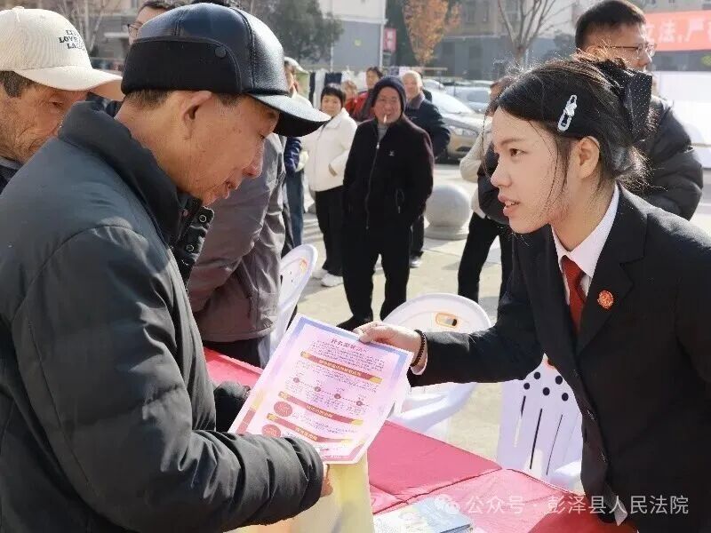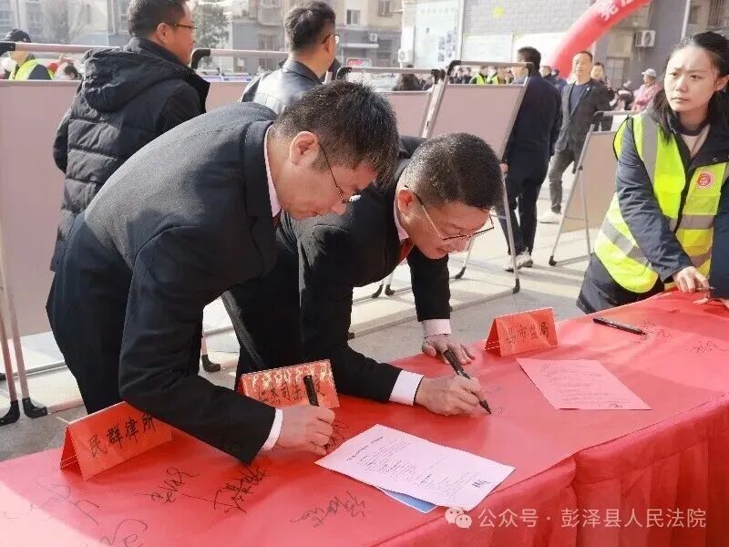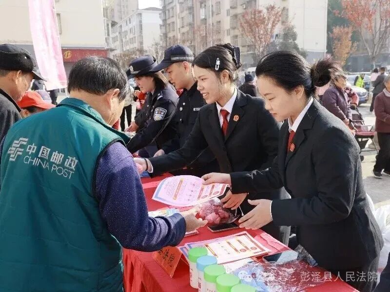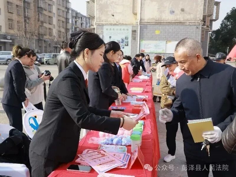 “我宣誓!”领誓人话音响起,干警们举起右拳,面向国旗庄严宣誓:“忠于中华人民共和国宪法,维护宪法权威,履行法定职责……”铿锵有力的誓言回荡在活动现场,既彰显了法院干警对宪法的尊崇与敬畏,更传递出践行法治使命的坚定决心。宣誓仪式后,干警们依次在“宪法承诺签名横幅”上郑重签下自己的姓名,一笔一划间,既是对坚守法治底线、捍卫公平正义的庄严承诺,也是对司法为民初心的切实践行。 摆摊送法:广场宣讲接地气 法治礼包暖民心