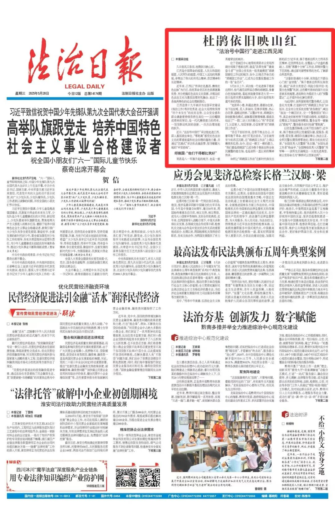 ![]() 杜鹃依旧映山红 “法治号中国行”走进江西见闻 几日春风又春雨,杜鹃依旧映山红。 江西是中国革命的摇篮、人民共和国的摇篮、人民军队的摇篮、中国工人运动的策源地,孕育出了伟大的井冈山精神、苏区精神和长征精神。 近年来,江西以“传承红色基因、赓续红色血脉”为己任,依托革命老区红色资源富集优势,充分挖掘红色法治文化资源,并推动红色法治文化与基层治理有机融合,走出了一条独具特色的社会治理新路径。 江西连续十九年被评为全国平安建设(综治工作)考评优秀省,社会大局持续保持“四个未发生”的良好态势,公众安全感和群众满意度持续保持在高位——这份耀眼成绩单的背后,是一代代赓续接力的传承、一项项联动机制的创新、一次次治理效能的跃升。 近日,“法治号中国行”采访组走进江西,深入基层政法单位,“零距离”感受红色法治文化的厚重底蕴和社会治理的蓬勃力量,并通过“沉浸式”采访和点滴故事,探寻赣鄱大地的“平安密码”。 ![]() 南昌是八一军旗升起的地方,也是一座英雄辈出的城市。 位于老城区中心地带的南昌市公安局西湖分局筷子巷派出所,就是“改革先锋”“最美奋斗者”“全国公安系统一级英雄模范”邱娥国曾经工作过的地方。如今,以他名字命名的“邱娥国工作法”,已成为公安基层基础工作的一张“金名片”。 5月21日上午,采访组一行走进筷子巷派出所时,恰巧遇见回所里办事的邱娥国。身着白色短袖的他,看起来就像邻家老大爷——依旧是那双厚实温暖的大手,依旧是那张和蔼可亲的笑脸。 “走街串小巷,和蔼态度亲,婆婆如在家,坐下拉拉呱,见人多询问,见事多观察,热心办民事,温暖送到家。”从警27年来,邱娥国大胆创新勤务模式,破解基层管理难题,摸索总结出了“一图二诀三本四勤五心”和“串百家门、认百家人、知百家情、办百家事”的“邱娥国工作法”。