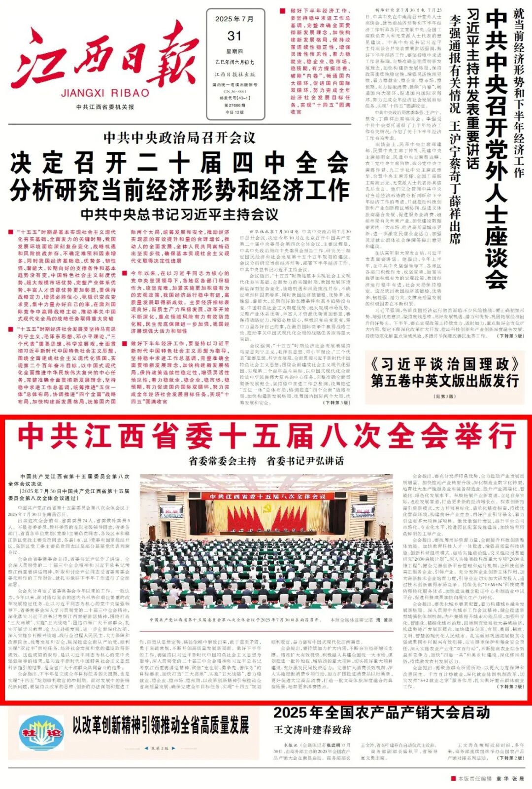 ![]() 中共江西省委十五届八次全会举行 省委常委会主持 省委书记尹弘讲话 中国共产党江西省第十五届委员会第八次全体会议决议 (2025年7月30日中国共产党江西省第十五届委员会第八次全体会议通过) 中国共产党江西省第十五届委员会第八次全体会议于2025年7月30日在南昌召开。 出席这次全会的有,省委委员74人,省委候补委员3人。不是省委委员、候补委员的在职省级领导同志,省委各部门、省直各单位党组(党委)主要负责同志,各设区市和赣江新区党政主要负责同志,各县(市、区)党委和国家级经开区、高新区党工委主要负责同志以及部分基层党代表列席会议。 全会由省委常委会主持,省委书记尹弘作了讲话。全会深入贯彻党的二十届三中全会精神和习近平总书记考察江西重要讲话精神,听取和讨论尹弘同志受省委常委会委托所作的工作报告,就扎实做好下半年工作进行了全面部署。 ![]() 全会充分肯定了省委常委会今年以来的工作。一致认为,今年以来,面对错综复杂的国内外形势和艰巨繁重的改革发展稳定任务,在以习近平同志为核心的党中央坚强领导下,省委常委会深入学习贯彻党的二十届三中全会精神,深化落实习近平总书记考察江西重要讲话精神,围绕打造“三大高地”、实施“五大战略”,团结带领广大干部群众,扎实开展学习教育,全力以赴抓发展,进一步全面深化改革,深入实施乡村振兴战略,践行全过程人民民主,大力保障和改善民生,统筹发展和安全,纵深推进全面从严治党,顺利实现“双过半”目标任务,经济社会发展和党的建设取得新成效。这些成绩的取得,是以习近平同志为核心的党中央坚强领导的结果,是习近平新时代中国特色社会主义思想科学指引的结果,是全省广大干部群众共同奋斗的结果。 全会指出,下半年是完成全年目标任务的关键期,也是实现“十四五”规划顺利收官的冲刺期。面对发展中的新情况新问题,要坚持以改革的思维、创新的办法谋划和推进工作,自觉从思维定势、路径依赖中解放出来,敢于直面矛盾,勇于突破常规,不断开创高质量发展新局面。做好下半年的工作,要坚持以习近平新时代中国特色社会主义思想为指导,深入贯彻党的二十届三中全会精神和习近平总书记考察江西重要讲话精神,聚焦“走在前、勇争先、善作为”的目标要求,加快打造“三大高地”、实施“五大战略”,着力稳就业、稳企业、稳市场、稳预期,以改革创新精神引领推动全省高质量发展,确保完成全年目标任务、实现“十四五”规划顺利收官,奋力谱写中国式现代化江西篇章。 ![]() 全会提出,要持续加力扩大内需,不断夯实经济增长支撑。精准扩大有效投资,积极融入共建全国统一大市场,谋划推进一批补短板、增后劲的重大项目,切实抓好重大项目建设,充分激发民间投资活力。完善扩大消费长效机制,深入实施提振消费专项行动,加力扩围推进消费品以旧换新,更好促进大宗商品消费,打造一批文商体旅深度融合的典型场景,培育更多消费热点。 全会提出,要充分发挥特色优势,全力推动产业发展提质增量。加快推动产业转型升级,深化制造业数字化转型,培育壮大生产性服务业和装备制造业,提升产业高端化、智能化、绿色化发展水平。积极拓展产业新赛道,立足自身实际,选准发展赛道,打造更多新的经济增长点。探索创新招商引资新模式,大力开展目标化、清单化精准招商,持续优化营商环境,构建良好产业生态,用好产业引导基金,着力引进更多大项目好项目。做优做强开发区,提升平台公司市场化、专业化水平,推进园区配套设施建设,加快培育特色鲜明的主导产业。 全会提出,要统筹用好资源力量,全面提升科技创新整体效能。加快教育科技人才一体推进,增强高质量科技供给,创新科研组织模式,启动实施前沿性、交叉性应用基础研究“2030启航计划”,深入实施省级科技重大专项“2030先锋工程”,健全完善创新平台管理和运行机制,让科技创新真正服务企业、引领产业。充分发挥企业创新主体作用,加大高新技术企业培育力度,引导企业切实加大研发投入,通过技术创新赢得市场竞争。持续优化“1+M+N”科技成果转移转化服务体系,加快建设概念验证中心和制造业中试平台,促进科技成果加快向现实生产力转化。 全会提出,要优化城乡要素配置,着力构建城乡融合发展新格局。深入贯彻中央城市工作会议精神,健全推进新型城镇化体制机制,内外兼修提升城市功能品质,加强科学化、智能化、精细化城市治理,因地制宜发展壮大县域经济,构建房地产发展新模式,加快建设创新、宜居、美丽、韧性、文明、智慧的现代化人民城市。扎实做好巩固拓展脱贫攻坚成果同乡村振兴有效衔接,压实耕地保护和粮食安全责任,深入实施农业产业化“双百行动”,不断提高农业综合效益和竞争力,加快“四融一共”和美乡村建设,深化移风易俗,持续激发农村发展活力。 全会提出,要聚焦群众所需所盼,以更大力度保障和改善民生。千方百计稳就业,深化就业体制机制改革,切实发挥“5+2就业之家”服务作用,扎实做好重点群体就业工作。用心用情办好民生实事,高质量实施教育强省建设各项任务,加快推进国家区域医疗中心和紧密型县域医共体建设,大力发展文化事业和文化产业,有效解决群众急难愁盼问题。巩固提升生态环境质量,深化绿色低碳发展体制机制