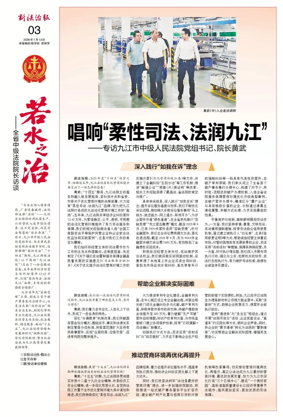 “当企业陷入债务僵局,厂房设备被封,法院却选择‘活封’——允许企业继续使用机器生产,以经营收入逐步偿还债务。这不是妥协,而是司法智慧的‘放水养鱼’。”近日,九江市中级人民法院党组书记、院长黄武在接受新法治报专访时,这样解释“柔性司法”。“十四五”期间,九江两级法院(以下简称“九江法院”)交出了一份亮眼的答卷:五年来审结涉经营主体纠纷案件12.42万件,打造“柔性司法、法润九江”品牌,多项创新举措获全国推广。 从全省率先“容缺受理”立案,到成立首个破产事务集约办理中心;从灵活采取“活封活扣”维系企业生机,到深化审判专业化建设,九江法院聚焦经营主体关切,依法履职,精准服务。面向“十五五”,九江法院将坚持和发展新时代“枫桥经验”,深化府院联动,努力让法治成为九江高质量发展最强保障。 ◎文/新法治报·赣法云记者王白如 ◎图/受访单位提供 深入践行“如我在诉”理念 新法治报:2025年是“十四五”收官之年。回顾这五年,九江法院在优化营商环境方面交出了一份怎样的答卷? 黄武:“十四五”期间,九江法院主动服务和融入新发展格局,紧扣党中央和省委、市委关于优化营商环境的决策部署,大力培育“柔性司法、法润九江”品牌,努力把九江法院打造成优化法治化营商环境工作的“高地”。五年来,九江法院共审结涉企纠纷案件12.42万件,为营造稳定、公平、透明、可预期的法治化营商环境提供了有力司法服务和保障。我们的相关经验做法曾入选“全国工商联依法平等保护民营企业和企业家合法权益协同实践案例”,这是对我们工作的肯定与鞭策。 我们始终将经营主体的司法需求作为工作的出发点和落脚点。在制度层面,先后制定了《关于强化依法履职服务保障金融高质量发展的实施意见》(司法服务金融20条)、《关于优化提升法治化营商环境工作的实施方案》(优化营商环境20条)等文件,并建立了金融纠纷“五段分治”等工作机制,推进“赋强公证”“预查(执)废证明”等改革,相关工作经验获得了最高法、省法院的肯定与推广。 具体来说就是,深入践行“如我在诉”理念,提升诉讼服务温度与效率。我们不断优化诉讼流程,推动绝大多数诉讼服务事项“马上就办、就近能办、网上通办、异地可办”。为涉企案件开通“绿色通道”,在全省率先推行“容缺受理”“先立案后缴费”模式,截至2025年9月,已有2925件案件适用“容缺受理”。针对金融案件,我们出台诉讼费用缓交办法,简化收退流程。截至2025年9月,共为9043件金融案件缓交诉讼费7685万元,有效降低了金融债权实现成本。 积极回应经营主体关切,依法维护其合法权益。我们做深做实府院联动机制,妥善审理了本地某上市企业买卖合同纠纷、某批发市场征收补偿纠纷、某共享单车行政强制纠纷等一批具有代表性的案件。在破产审判领域,我们牵头成立了全省首个破产事务集约办理中心,构建了环节少、用时短、流程优的破产办理机制,入选全省法院服务保障营商环境优化升级典型事例。在破产案件办理中,精准区分“僵尸企业”与具有挽救价值的企业,分别通过清算出清或重整、和解方式处理,力求实现最佳的效果。 平衡保护与规制,旗帜鲜明展现司法作为。一方面,我们坚持审慎、善意、文明司法,依法慎用强制措施,探索司法助企信用修复机制,通过建立被执行人“白名单”、出具《信用修复证明》等方式,帮助诚信经营主体重返市场。对暂时困难但有发展前景的企业,灵活采用“活封活扣”等措施,保障其持续经营。另一方面,针对执行难问题,我们深入开展专项执行行动,强化与公安、检察机关的协作,依法打击拒执行为,有力维护司法权威,助推社会诚信体系建设。 帮助企业解决实际困难 新法治报:在打造一流法治化营商环境过程中,九江法院开展了哪些亮点工作,有什么特色? 黄武:我们着力在专业化、人性化上下功夫,形成了一些自身的特色。 深化“分调裁审”机制改革。我们突破固有案由划分模式,围绕诉求、事实和法律关系制定繁简分流标准,将简案范围扩大至所有民商事案件,实现“当简则简、应简尽简”,促进审判质效整体提升。 大力推进审判专业化建设。金融审判方面,在中心城区设立专业金融法庭,并联合相关部门深化金融纠纷多元化解。破产审判方面,积极争取市委市政府支持,将破产援助资金池提升至300万元,着力破解“无产可破”案件启动难题。知识产权审判方面,与市场监管部门建立协同保护机制,探索“行政调解+司法确认”新模式。 创新执行方式方法。灵活运用“活封活扣”与“动态查封”,力求在不影响企业生产经营的前提下实现债权。例如,九江经开区法院在办理某新材料公司拖欠租金案中,采取“活查封”方式,助推企业恢复活力,使案件全部执行到位。 坚持“请进来”与“走出去”相结合。通过开展“法院开放日”活动、企业家座谈会、“直通车”约见院长等方式,倾听企业声音。同时,将企业的“需求清单”转化为法院的“履职清单”,切实帮助企业解决实际困难,增强其发展信心。 推动营商环境再优化再提升 新法治报:展望“十五五”,九江法院将采取哪些措施营造更好的法治化营商环境? 黄武:“十五五”时期,九江法院将贯彻落实市委十二届十九次全会精神、市委经济工作会议精神,进一步深化思想认